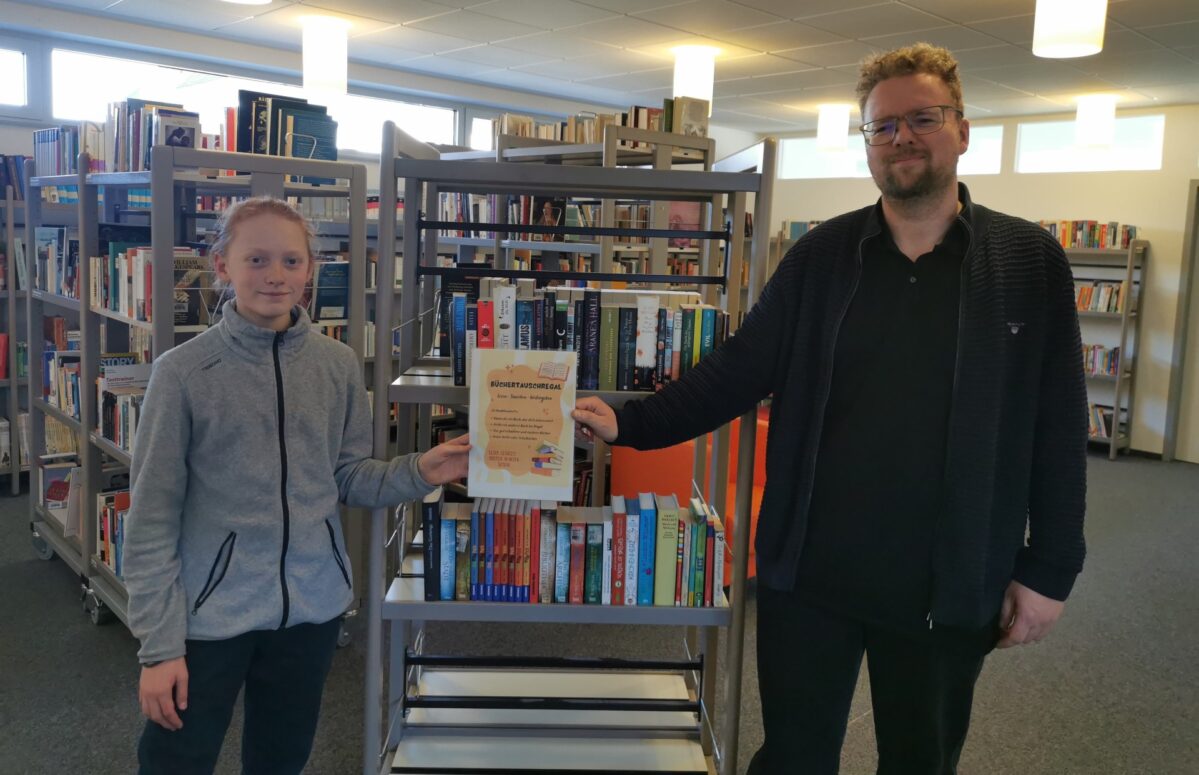 Nachdem mir diese Idee gekommen war, erzählte ich Herrn Kirsch davon, bei dem ich damals in der Schülerfirma-AG war. Herr Kirsch nahm die Idee auf und kontaktierte Herrn Ulm, der für die Bibliothek zuständig ist. Es hat ein bisschen gedauert, bis ein passender Platz in der Bibliothek gefunden war, doch jetzt steht das Büchertauschregal einsatzbereit an Ort und Stelle. Falls du also Bücher hast, die du nicht mehr brauchen solltest, stell‘ sie doch ins Büchertauschregal und such‘ dir dafür neues heraus.