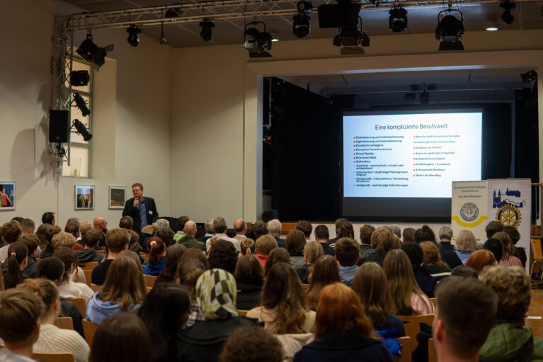 Ebenfalls bewegend waren die Texte von Riya Singh und Vanessa Pick. Beide Werke sind in einem Schreibkunstworkshop mit dem Autor Wolfgang Büscher entstanden und werden auch auf der Frankfurter Buchmesse präsentiert. Zum Abschluss des Programms in der Aula präsentierte Maja Marlen Steiger einen Poetry Slam, der viele zum Nachdenken anregte. Mit einer Darbietung von „Night and Day“ von Cole Porter, erneut vorgetragen von Frau Menzer und Herrn Brauer, endete der künstlerische Teil des Vormittags.