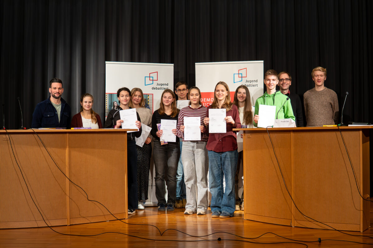 Die Finaldebatte der Sekundarstufe II widmete sich der gesellschaftlich hochaktuellen Fragestellung „Soll eine allgemeine Dienstpflicht für Jugendliche eingeführt werden?“. Finn-Luca Keil, Phoebe Stör, Hannah Kirschner und Paulina Bergmann beleuchteten das Thema aus unterschiedlichen Perspektiven und diskutierten unter anderem Fragen der Generationengerechtigkeit, der persönlichen Freiheit sowie des gesellschaftlichen Zusammenhalts. Die Debatte zeichnete sich durch differenzierte Argumente und eine lebhafte Auseinandersetzung aus. Am Ende konnten sich Finn-Luca Keil und Phoebe Stör besonders hervorheben.