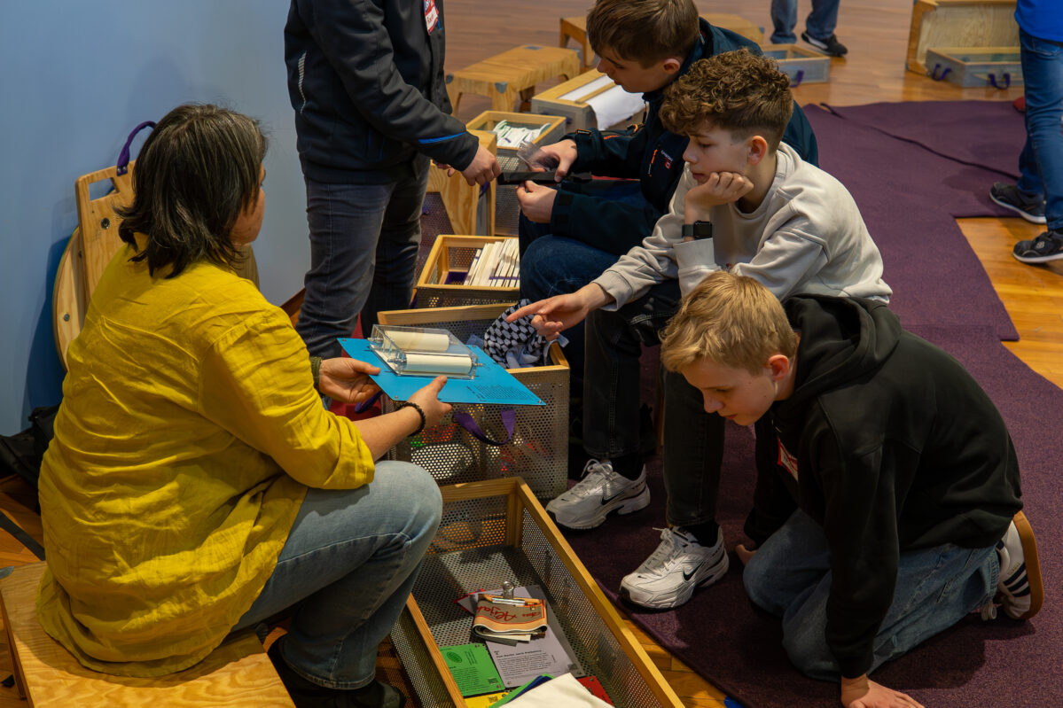 Am Freitag, den 6. März, hatten wir als eine von nur vier Schulen in ganz Hessen das Jüdische Museum Berlin bei uns an der Schule zu Gast. Jedes Jahr tourt das Museum mit einer mobilen Ausstellung und eigenen Teamerinnen und Teamern durch verschiedene Bundesländer, um einen Ort der Begegnung und des Austauschs sowie eine Möglichkeit des Kennenlernens der jüdischen Kultur zu schaffen. Für die Schülerinnen und Schüler der Ethik- und Religionskurse der Jahrgangsstufe 7 fand in diesem Zusammenhang ein Projekttag statt und sie lernten in verschiedenen Workshops etwas über die jüdische Religion und Kultur sowie über die jüdisch-deutsche Geschichte und Gegenwart. In der mobilen Ausstellung gab es eine Vielzahl an Exponaten zu entdecken, die die jüdische Kultur veranschaulichten. Die Schülerinnen und Schüler konnten zum Beispiel etwas zur Tora und dem Talmud, zu den Speisegesetzen, zum Ruhetag Schabbat, zu jüdischen Orten und zur Bedeutung von Migrationsgeschichten für das heutige jüdische Leben in Deutschland erfahren. Am Ende des Tages zeigten sich die Teamerinnen und Teamer des Jüdischen Museums begeistert vom Interesse und der Mitarbeit unserer Schülerinnen und Schüler.