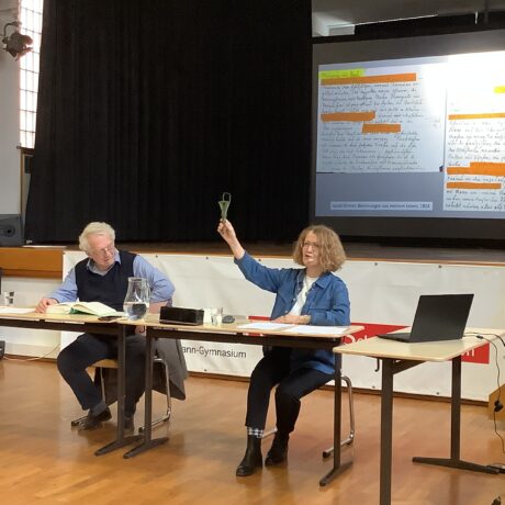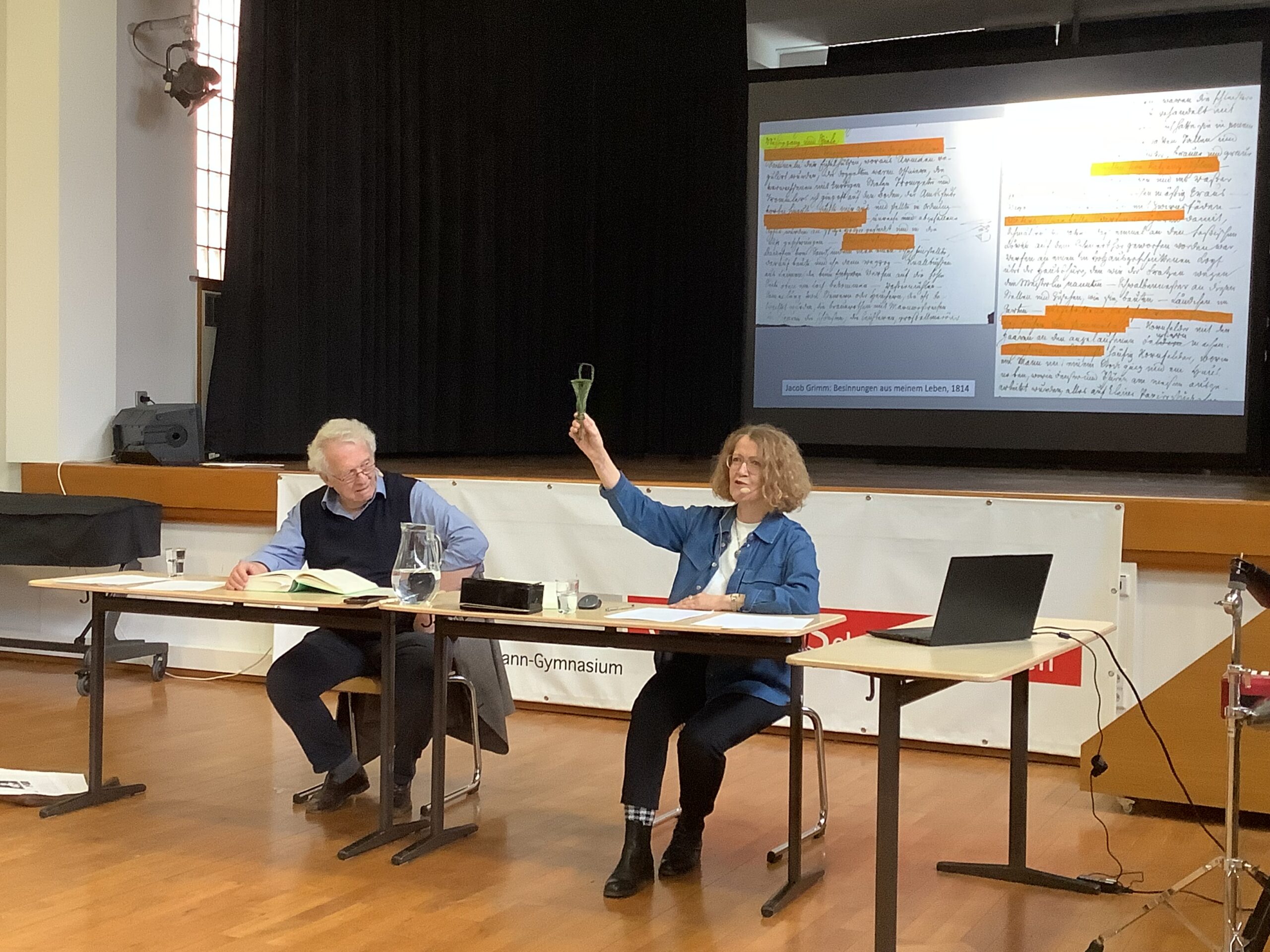 Anlässlich des diesjährigen Literarischen Frühlings war die Kulturhistorikerin Dr. Andrea Linnebach-Wegner in der vollbesetzten Aula des Gustav-Stresemann-Gymnasiums zu Gast, um den anwesenden Oberstufenkursen ihre Begeisterung für die Briefe der Brüder Grimm und deren Bedeutung für die Sprach- und Kulturforschung näherzubringen.